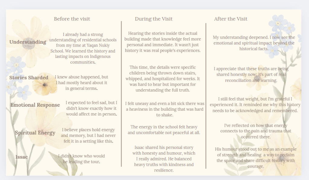 Even though I learned about residential schools before through Yaqan Nukiy school, visiting St. Eugene added a personal, emotional, and spiritual layer to that learning. It reminded me that truth and reconciliation are not just academic they are lived experiences that continue to shape people and places today. Isaac’s storytelling and humour showed what strength and healing can look like, and the energy in the space reminded me why it’s so important to keep these stories alive with respect and empathy.